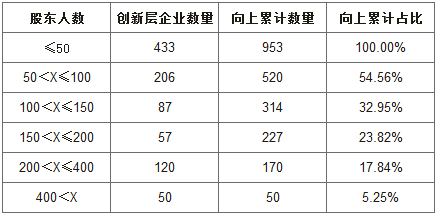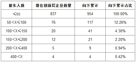 下表是对潜在创新层企业股东数量的统计。有117家企业股东人数超过50人,5家企业超过200人,400家企业超过4人。可见,如果股转将“股东人数”作为筛选标准,将有众多潜在创新层企业落选。